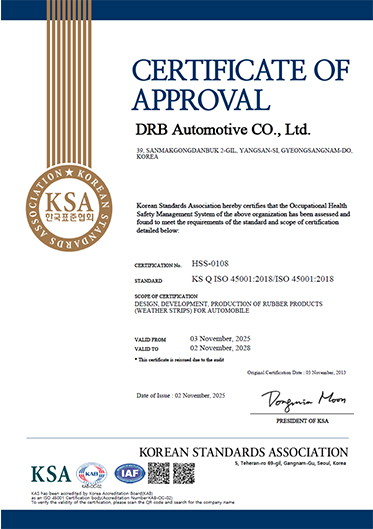 DRB오토모티브는 국제 표준화 기구(International Organization for Standardization)에서 제정한 글로벌 안전보건경영시스템(ISO45001) 인증을 2013년 최초 취득 후 이를 통해 설계, 개발 및 생산 등 전 사업영역에 걸쳐 안전보건경영을 실시/유지관리 하고 있으며, 그동안 축적된 관리 경험과 시스템을 전 현장에 체계적으로 적용하고 있습니다.